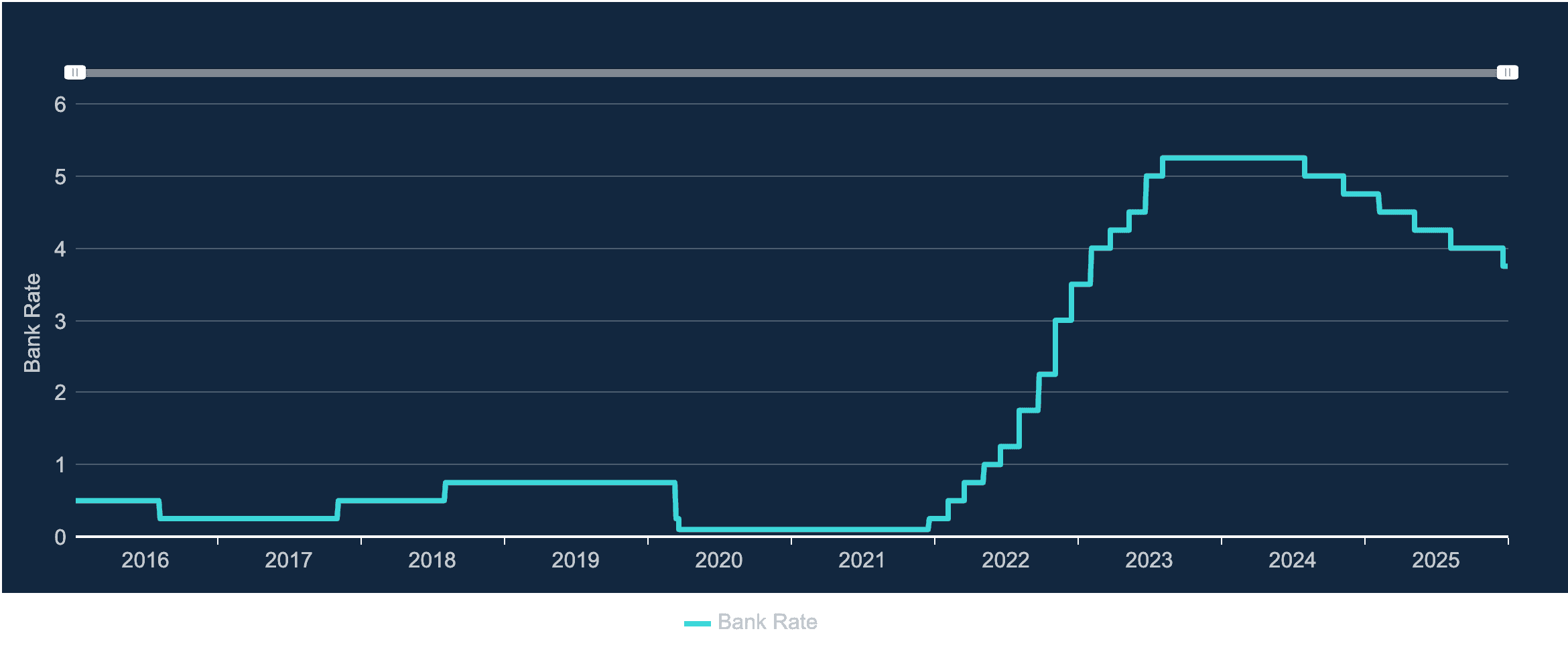 Bank of England base rate Jan 2016-Dec 2025 taken from Bank of England Database